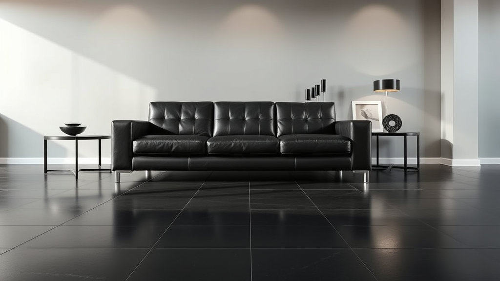 블랙 가죽 소파, 철제 프레임, 무광 블랙 타일처럼 질감이 살아 있는 소재를 선택하면 단조로움을 줄이고 고급스러운 분위기를 연출할 수 있습니다.